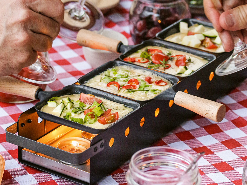 Käseschmelzer für die ganze Familie mit 4 antihaft-beschichteten Pfännchen. Ausgestattet mit Power-Kerzen für einen gemütlichen Racletteplausch. Praktischer und mobiler Edelstahlbehälter für die Rechaudkerzen.